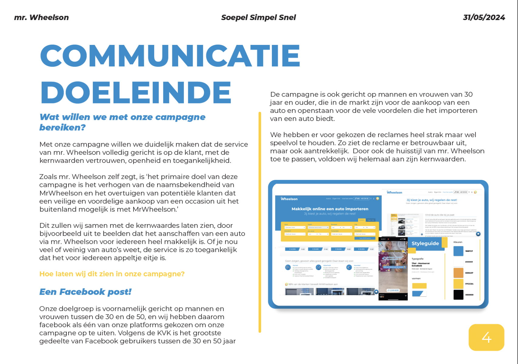 De opdrachtgever voor dit project was Mr.Wheelson. Vanuit de Haagse Hogeschool hebben wij een briefing gekregen over het bedrijf en wat de doelen waren voor de campagne. Wat Mr.Wheelson graag wilde is naamsbekendheid, vertrouwen opbouwen met zijn klanten en Laten zijn dat het importeren helemaal niet moeilijk hoeft te zijn. Dit waren ook de punten waar wij als team verder mee zijn gegaan.